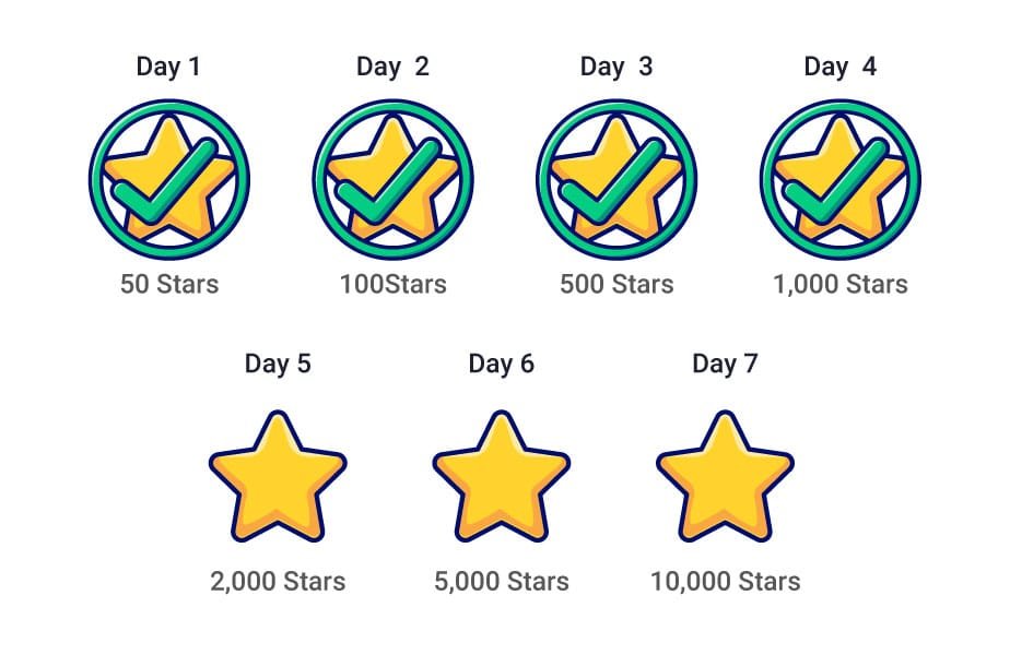 Earn Stars daily by logging into Packell. Your rewards increase with each consecutive day, starting at 50 and reaching up to 10,000 Stars if you log in without missing a day. If you skip a day, the streak resets, and you start again from 50 Stars. Stay consistent to maximize your rewards.